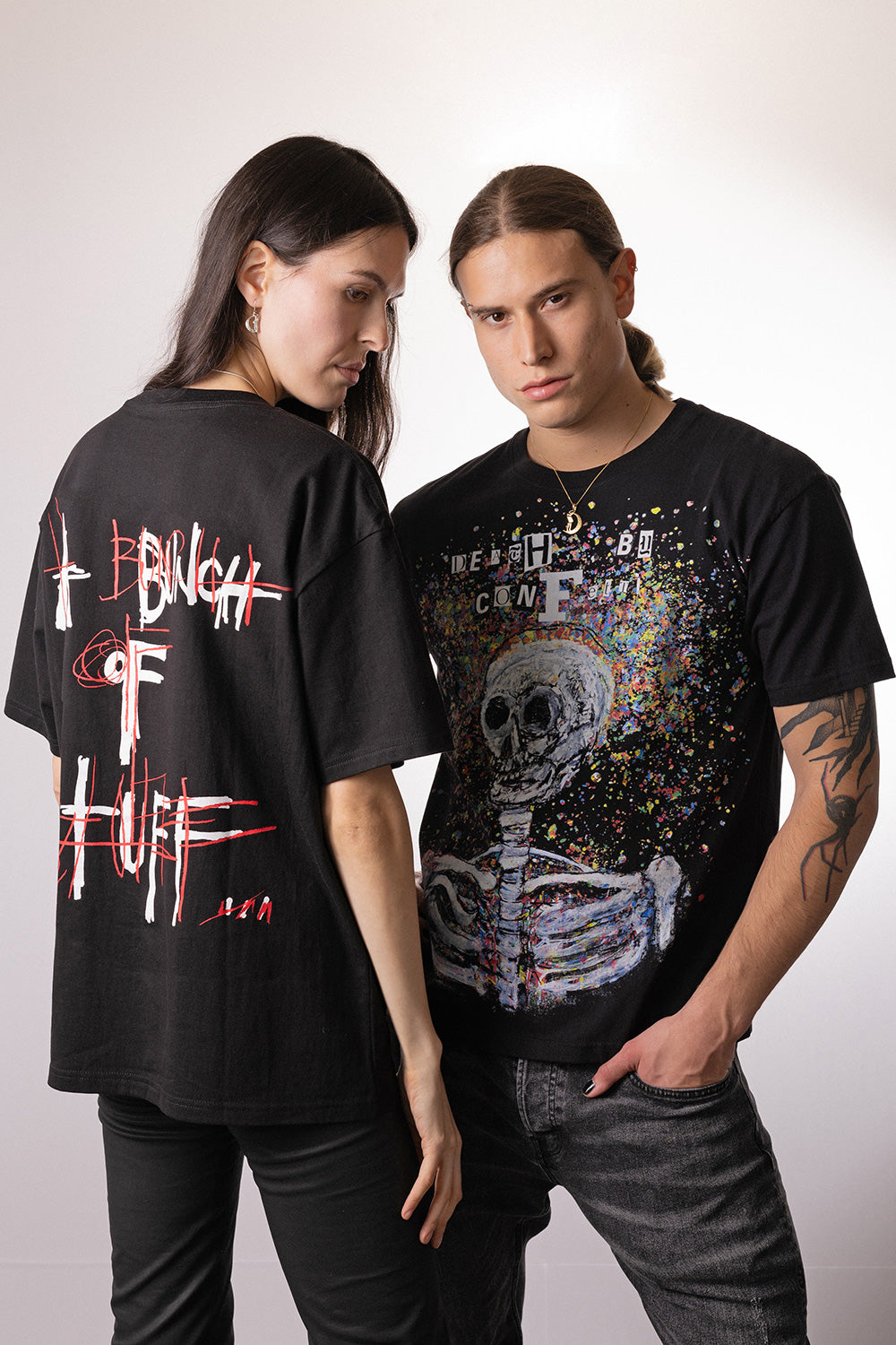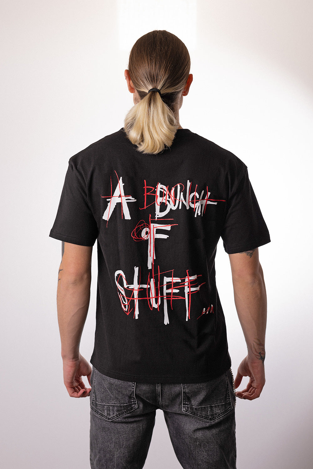 This black t-shirt features the "A Bunch Of Stuff" exhibition logo, based on Johnny Depp's original sketch, printed large on the back. Celebrate Johnny Depp's first solo exhibition with a simple yet stylish design. The front features a gold Bunny Man embroidered on the front.