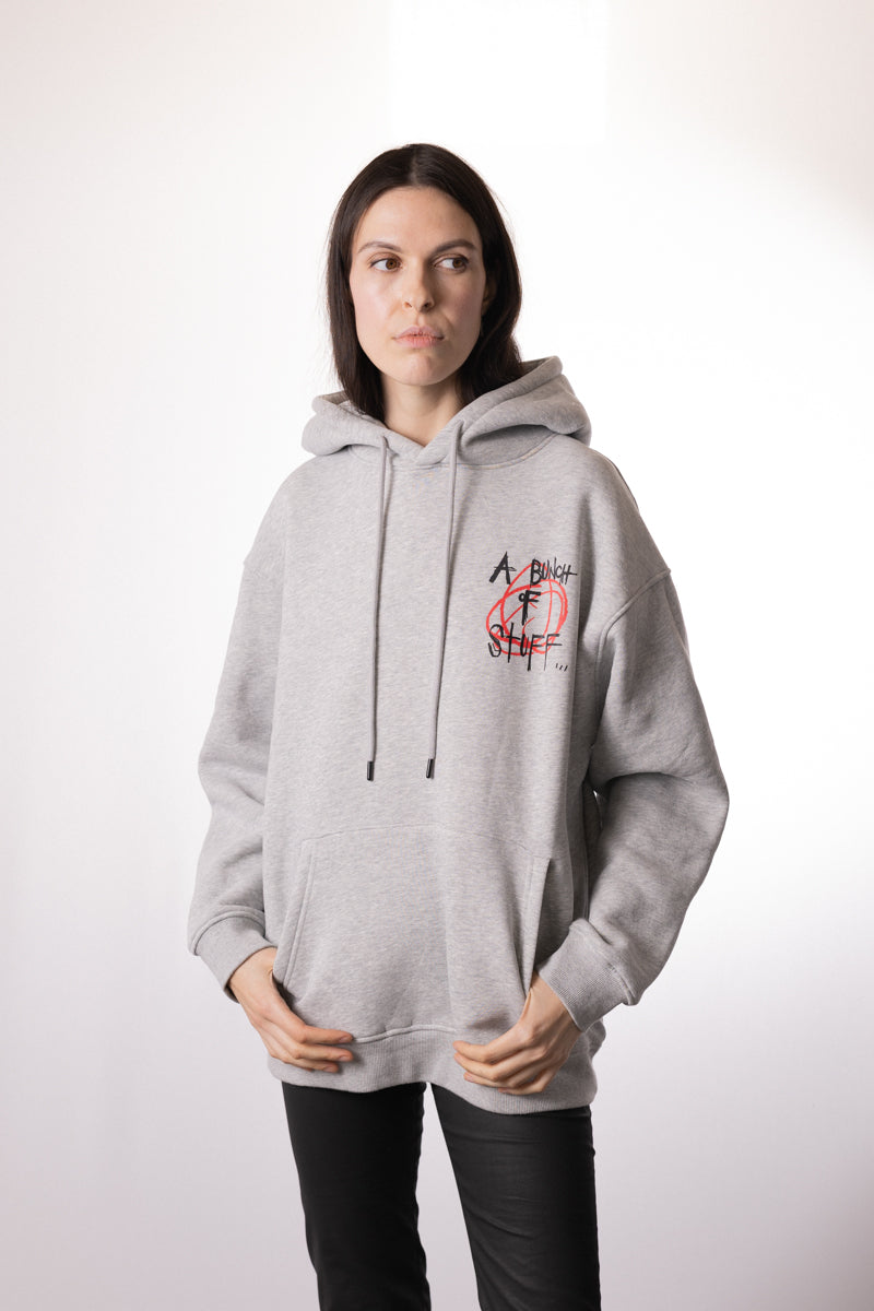 This grey Marl hoodie features the "A Bunch Of Stuff" exhibition logo, based on an original sketch by Johnny Depp, printed prominently on the back, along with other sketches of Johnny Depp himself, including the eponymous Bunny Man.