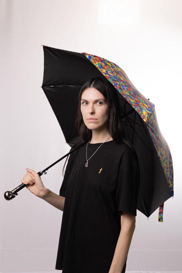 This umbrella, inspired by Johnny's "Death By Confetti," brightens up a gray, rainy day. The umbrella fabric features a psychedelic confetti print. The handle features a smiling metal skeleton and the words "Death by Confetti" on the inside. This sturdy, straight-cut umbrella features windproof construction and automatic opening and closing.
