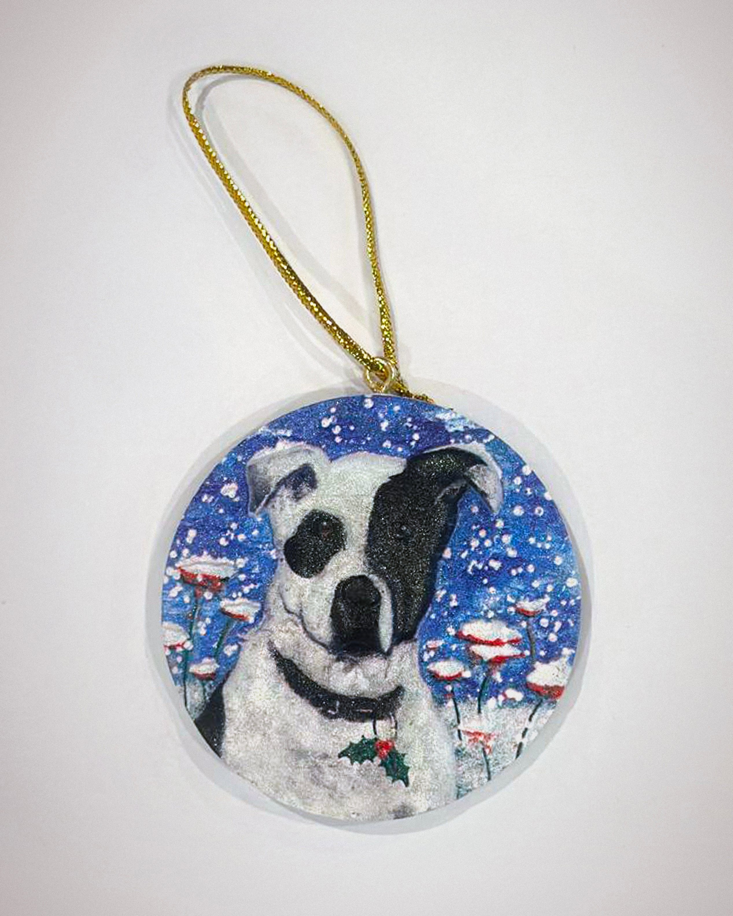 Celebrate the holidays with your furry buddy! "Mooh" is a charming ornament featuring a portrait of JD's beloved dog, Mooh, wearing a festive Santa hat. Inspired by Mooh's unique personality and presence in the exhibition, this ornament will add warmth, joy, and playfulness to your tree. Perfect for dog lovers and fans of JD's work, it's a heartwarming reminder of the unconditional love our pets bring us.