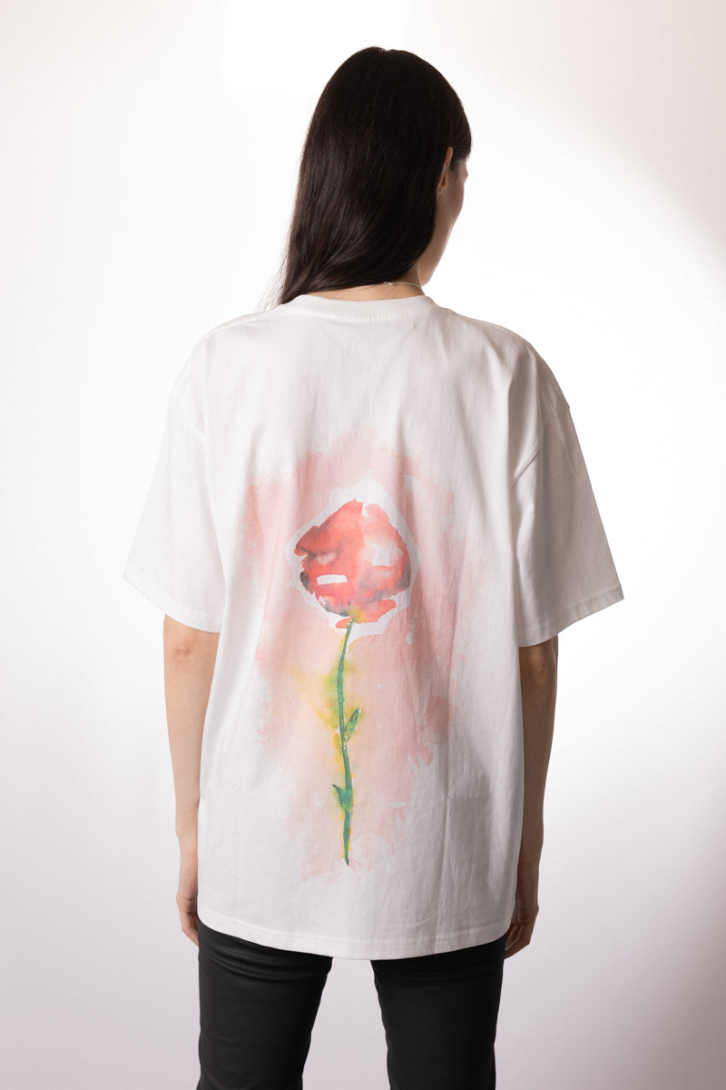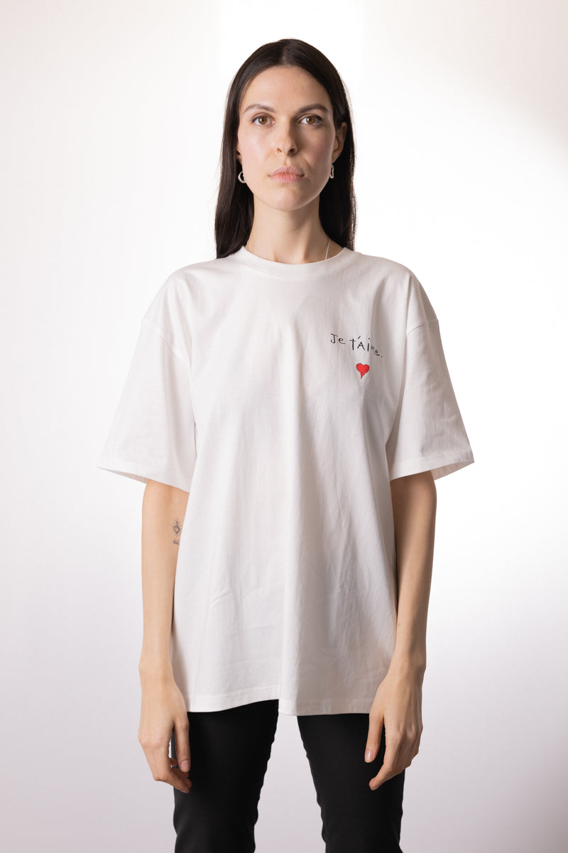 This Je T'aime T-shirt features a rose print on the back and the words "Je T'Aime" (French for "I love you") on the front. Inspired by Johnny Depp's artwork, the design delicately expresses secret love through a single rose that acts as a beautiful letter. The design reflects a portrait of his daughter.