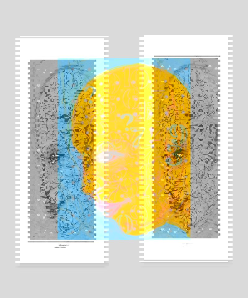 A mini print from the work "Meditation II," featuring Johnny's recurring character, "The Everyman," who is a key theme of the exhibition.