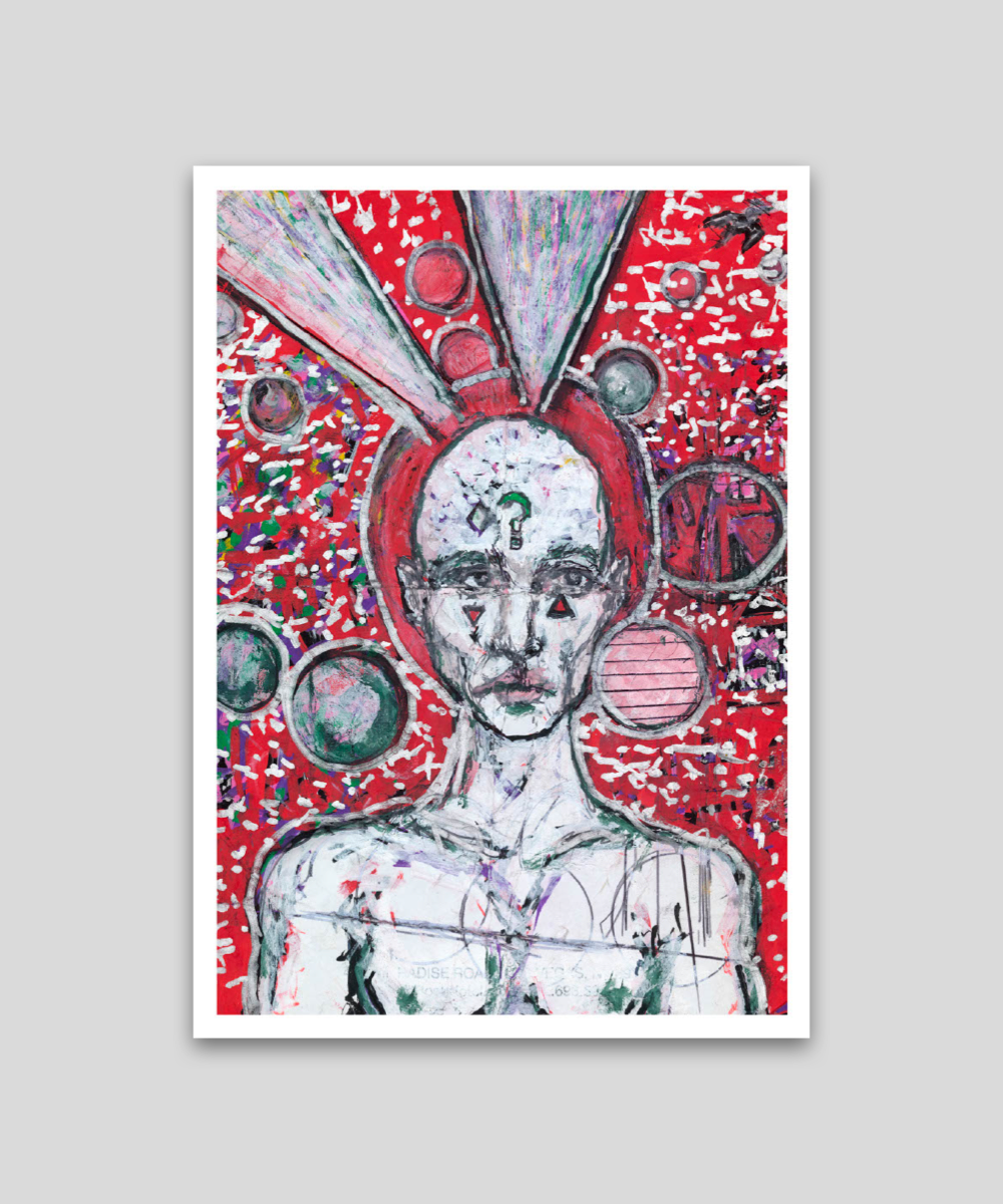 This piece, part of Johnny Depp's "Everyman" series, features bold colors and his trademark question mark, creating a vibrant and rich piece drawn with Liquitex acrylic markers.