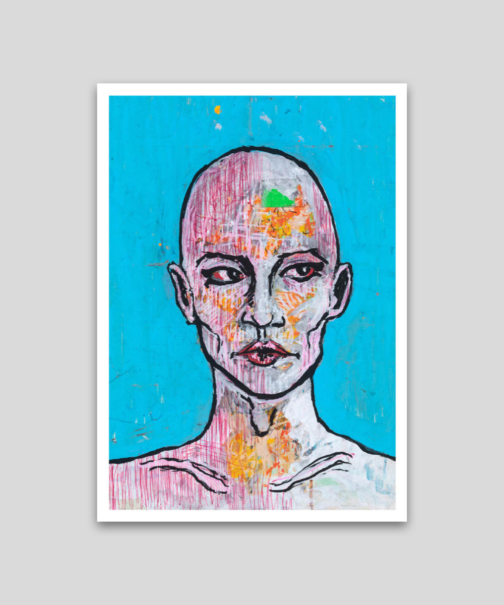 This bold mixed-media depiction of Johnny Depp's "Everyman" combines acrylic, pen, and pencil, highlighting Johnny's versatility and playful creativity. Based on an original drawing by Johnny Depp from 2015.