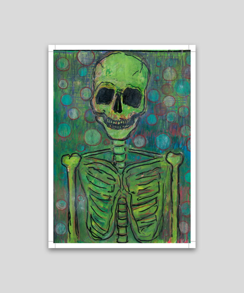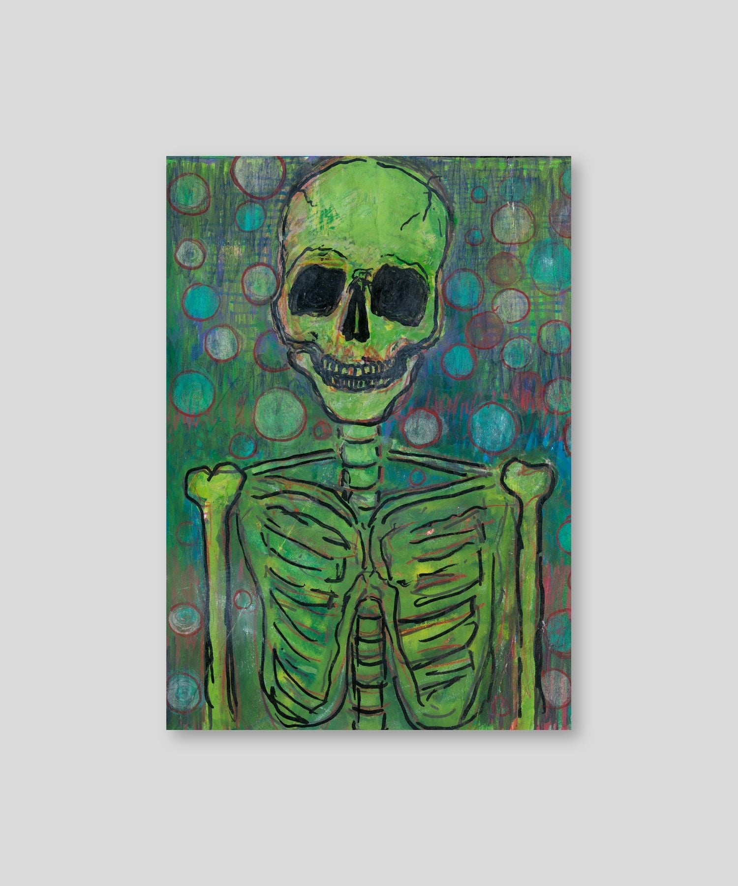 この作品では、骸骨のモチーフが遊び心のある球体と大胆な色調と融合しています。ジョニー・デップの特徴的なスタイルで、不気味なテーマと軽快さが見事に調和しています。制作年不明のジョニー・デップのアートワークを基にしています。