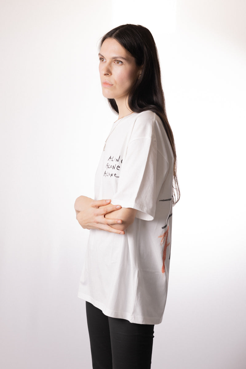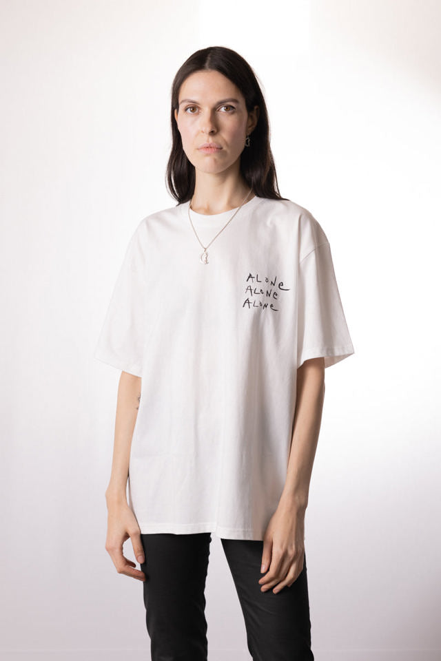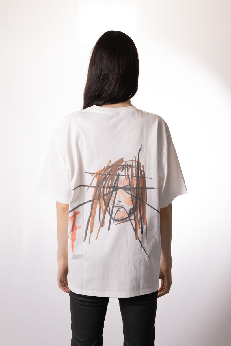 このTシャツは、ジョニー・デップの絵画「Alone Alone Alone」が背面にプリントされています。「顔というよりは傷つけられたもの」と表現されるこのアートワークは、展覧会の重要な一部となっています。