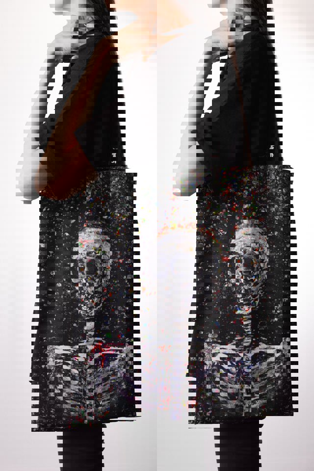 ジョニー・デップの作品にインスパイアされた「Death By Confetti」トートバッグは、ツインハンドルとオープントップが特徴です。ジョニー・デップのシグネチャーであるバニーマンがあしらわれた、黒いショルダーストラップのついたヘビーウェイトトートバッグです。