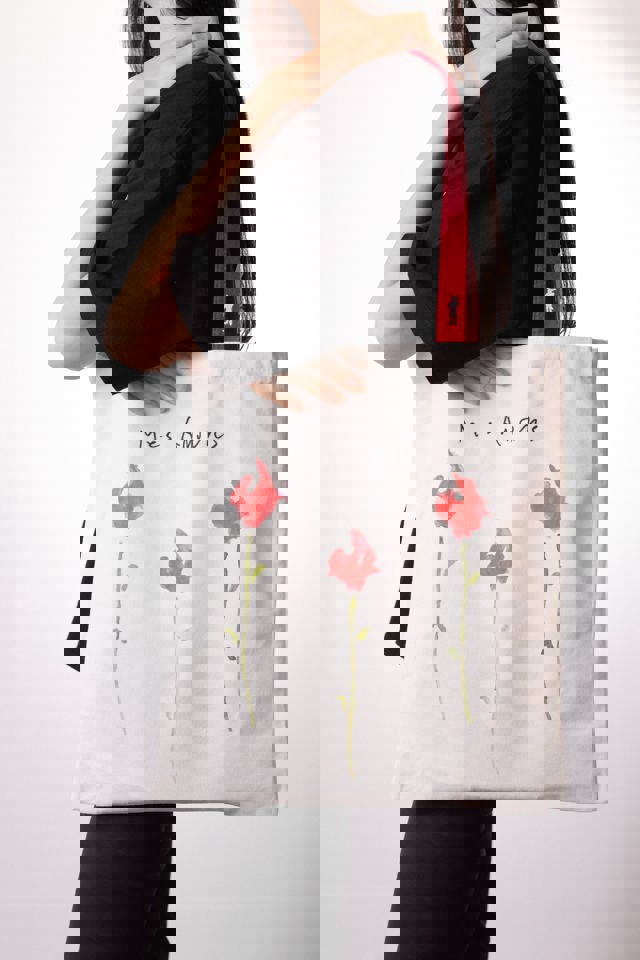 このヘビーウェイトトートバッグは、ジョニー・デップのシグネチャーであるバニーマンがあしらわれた赤いショルダーストラップが特徴的です。